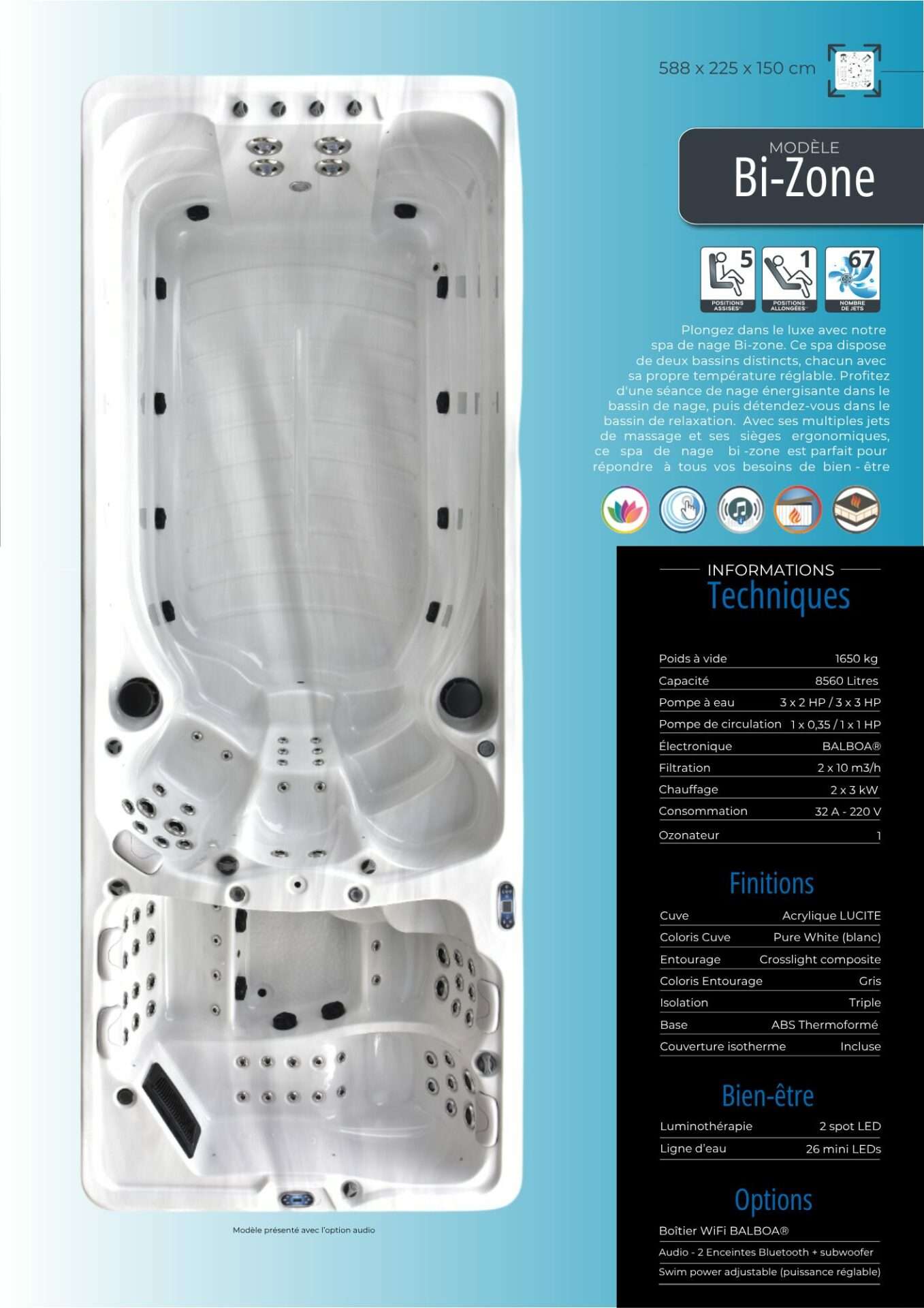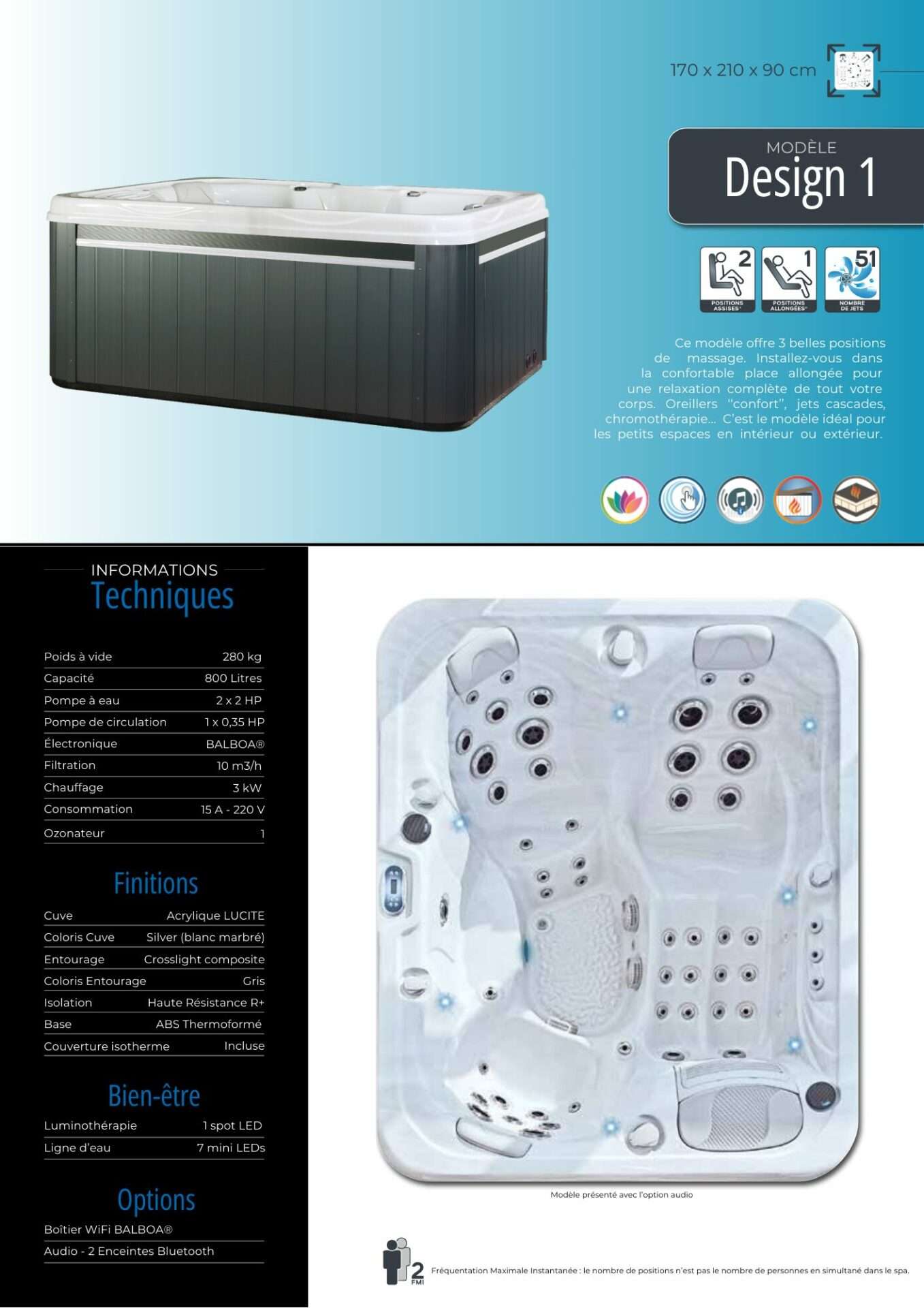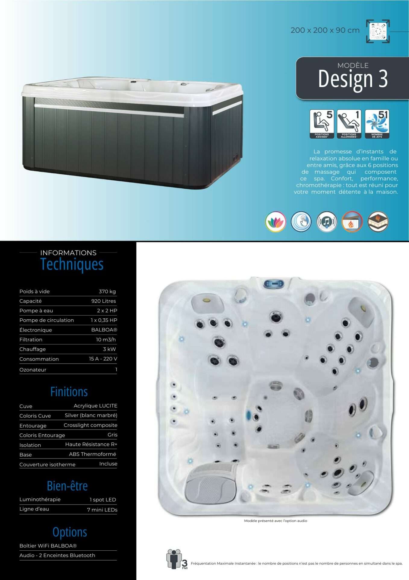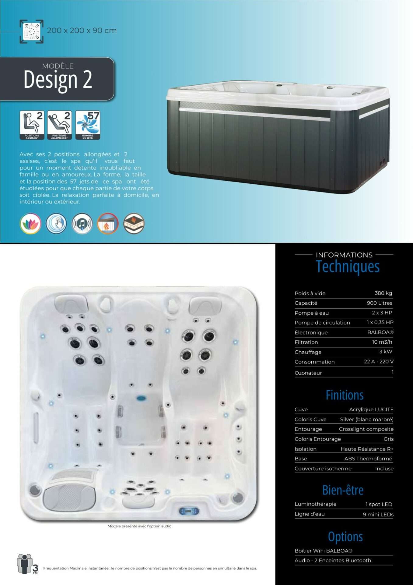 Nous avons opté pour un châssis en acier inoxydable pour toute notre collection. Contrairement aux idées reçues, ce châssis ne transmet pas plus les vibrations qu’un châssis en bois. De plus, toutes nos gammes sont équipées de vannes venturi pour l’ajout d’air dans les massages. Nous avons décidé de ne pas intégrer de blower car ils sont trop bruyants et l’injection d’air en grande quantité ne facilite pas le traitement de l’eau.