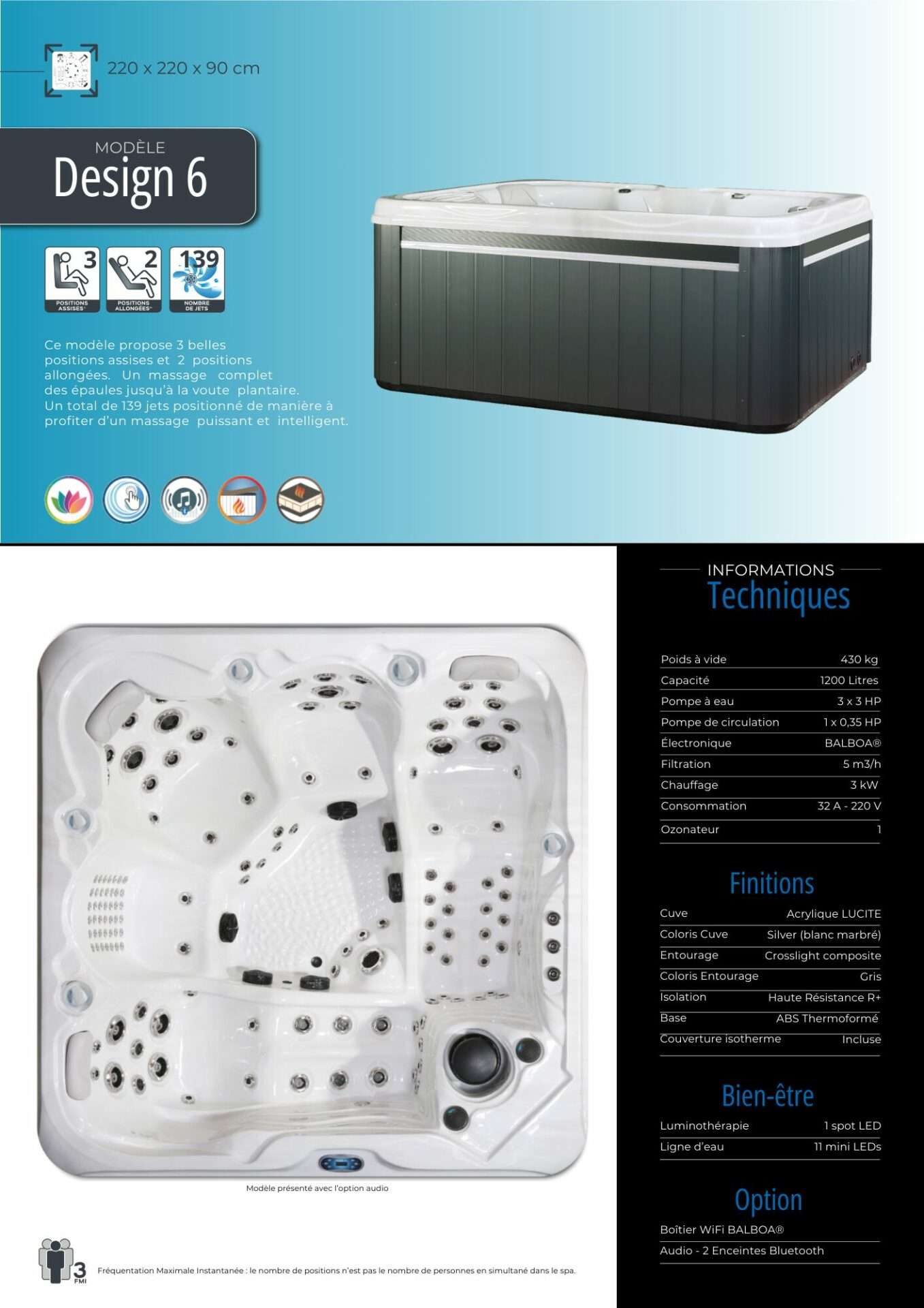 Pour les plus exigeants, la gamme Design de DESIGN SPA propose des spas de 2 à 6 places. Comparés à la gamme Plug and Play, ces spas offrent plusieurs améliorations : une isolation plus épaisse (et donc plus performante), des jets réglables et plus esthétiques, ainsi qu’un entourage plus élégant. Ces spas apportent confort, relaxation et massages thérapeutiques. De plus, les spas Design restent silencieux grâce à une filtration assurée par une pompe de circulation, contrairement aux pompes bi-vitesses qui génèrent plus de bruit lors des cycles de filtration et de chauffe. Chaque spa Design est fabriqué selon les spécifications exactes de vos clients, intégrant des matériaux haut de gamme et des fonctionnalités innovantes.