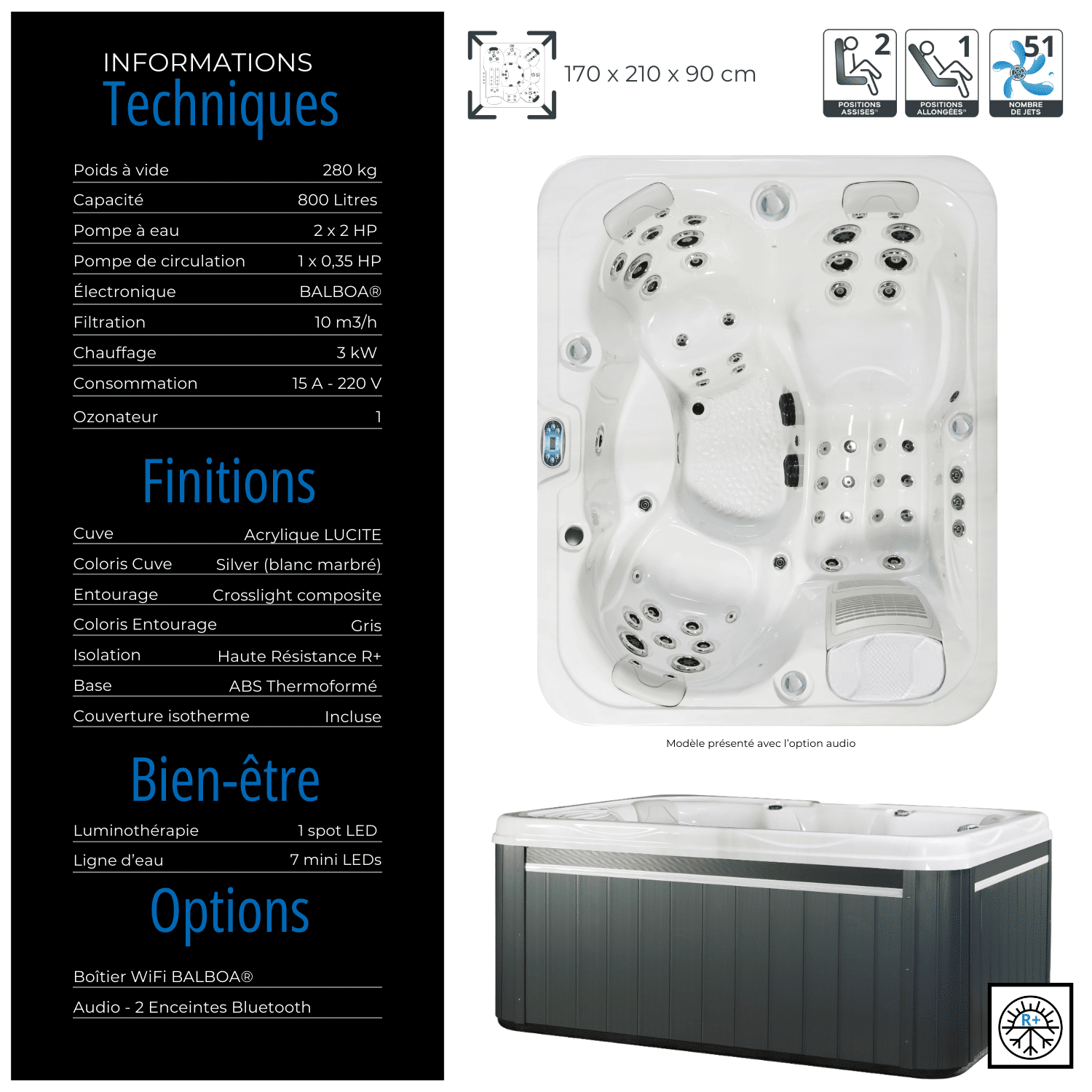 • Jets de massage 51 hydrojets, dont plusieurs lumineux
