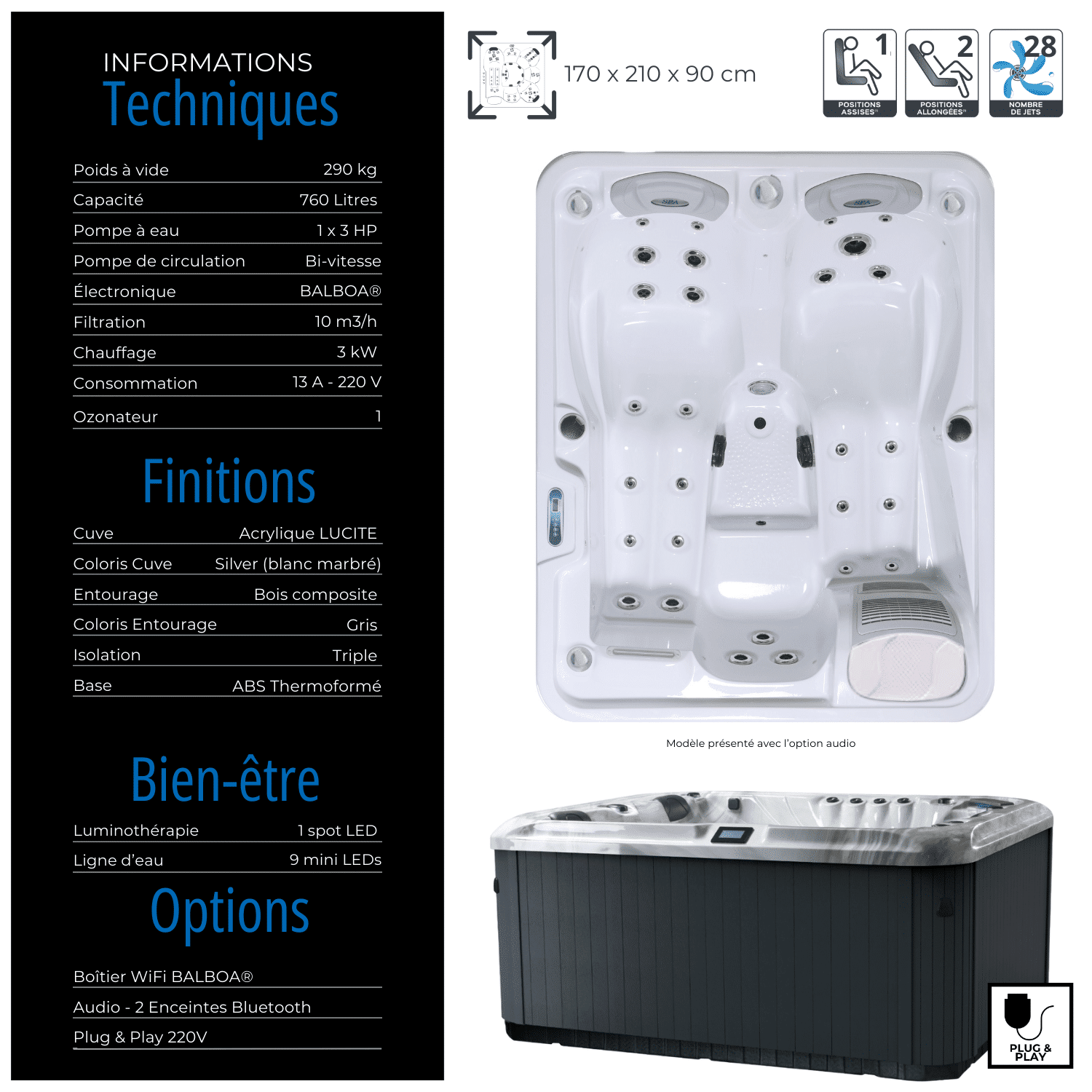 Le Spa Design 2 est le modèle Design dédié aux instants de complicité. Avec ses 2 places allongées, il offre une configuration idéale pour un massage couché, dans un format compact et raffiné. Ce spa 4 places concentre l’essentiel du confort et de la technologie.