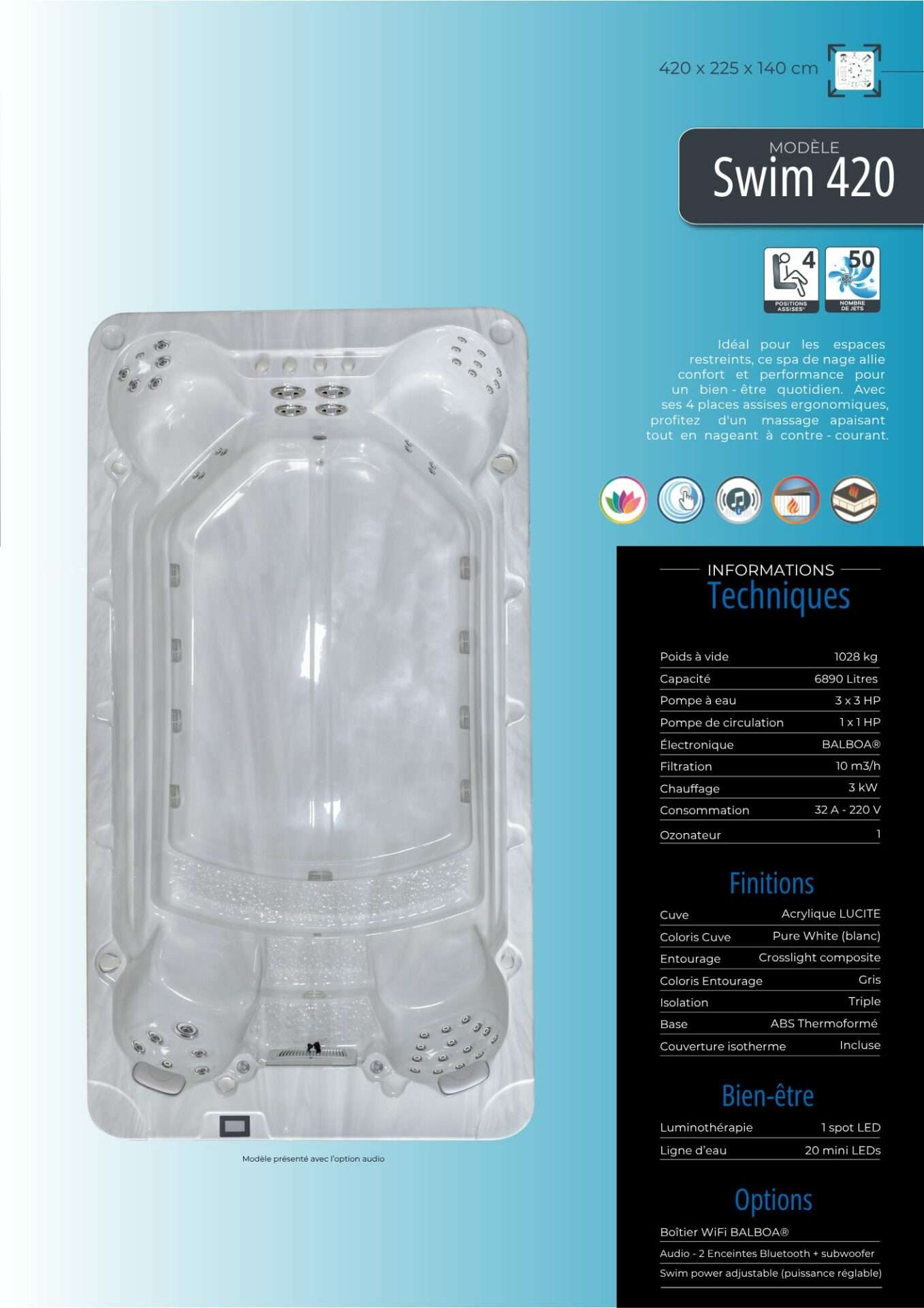 Le spa de nage compact SWIM420 est la solution idéale pour ceux qui recherchent un bassin de moins de 10 m² combinant espace de nage à contre-courant et zone de détente avec massage. Il s’intègre facilement dans les jardins, terrasses ou espaces bien-être, même restreints.